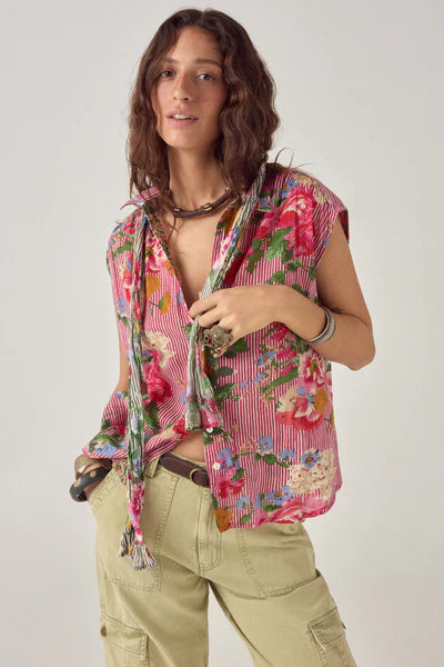 La stampa Bolton Soul è qui presentata nella sua forma più diretta. Senza maniche, il motivo aderisce meglio al corpo, permettendo al colore e alle proporzioni di risaltare. I fiori appaiono più pieni e saturi, su uno sfondo a righe rosse delicate che conferisce struttura e ritmo.